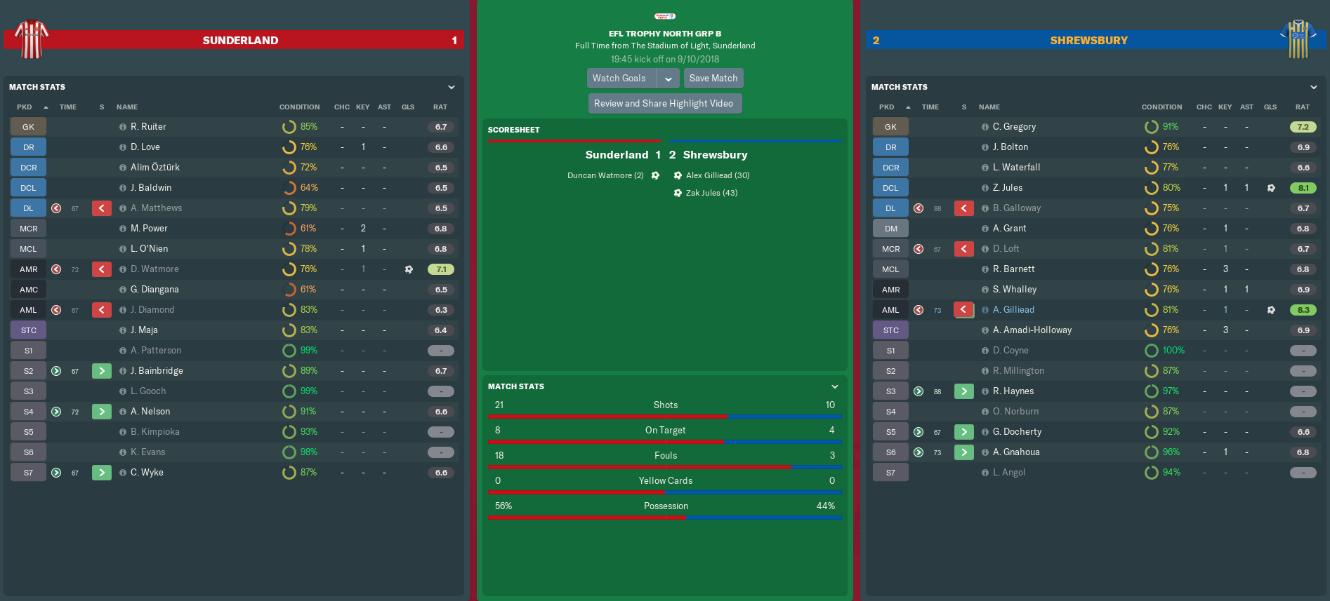 However, Gilliead went from zero to hero in the 30th minute, with the winger driving a tame long-range shot past home goalkeeper Robbin Ruiter to level. The assist came from centre-back Zak Jules, who would find the net himself two minutes from half-time. A powerful finish from Shaun Whalley‘s corner opened Zak’s Shrews account and sent us 2-1 ahead. Now the Stadium of Light really did sound empty.