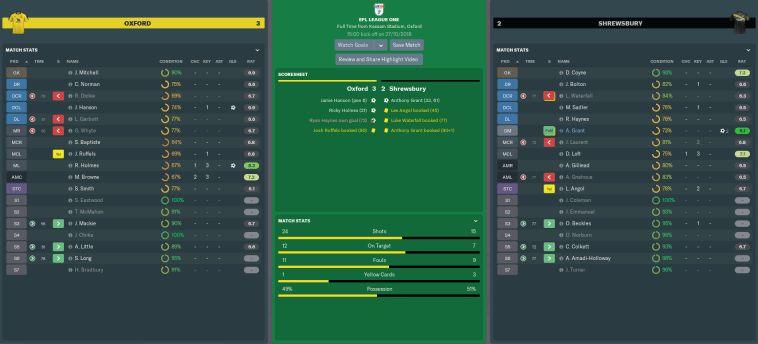 A tricky run of October fixtures ended with another daunting test, this time against in-form Oxford. As Beckles was out of form, I gave Luke Waterfall just his second Shrews start in central defence. He repaid me by hauling down U’s striker Sam Smith in the penalty area after just six minutes, and it looked like the writing was on the wall when Jamie Hanson converted his spot-kick.