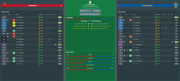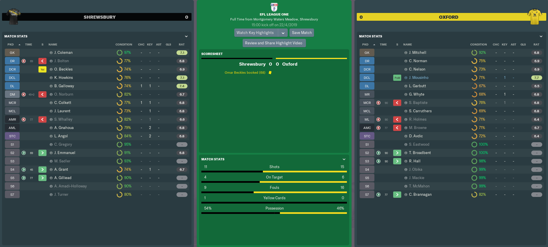 Indeed, Davies would score after half an hour. Unfortunately for him, it was into his own net that he deflected a shot from Shrews counterpart Beckles, whose header had just been parried by goalie Lee Burge. I’d actually had the former Portsmouth defender on my shortlist and briefly considered making a move for him when he was transfer-listed in January. After that own goal, I was quite glad I didn’t!