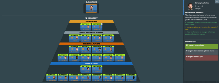 There were similar positive signs when I looked at our social groups. Instead of splitting themselves up into a load of small cliques, the players were in two relatively large social groups. To be fair, the vast majority of them had ‘Balanced’ personalities and had been at the club for only a couple of seasons at most.