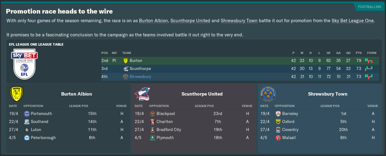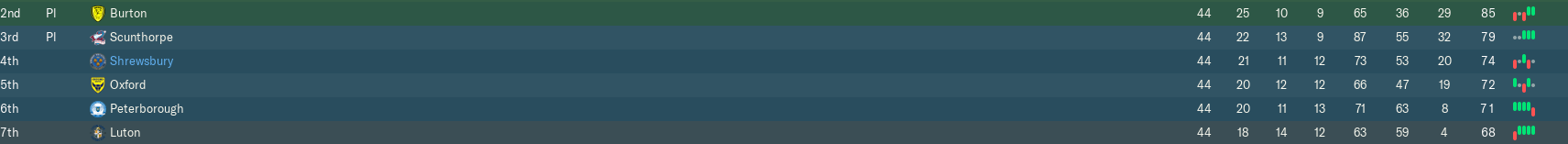 Burton were six points clear of both Scunthorpe and Shrewsbury, though their run-in was not the easiest. If they slipped up, there was a good chance for either us or Scunny to take advantage, as long as we won our remaining games.