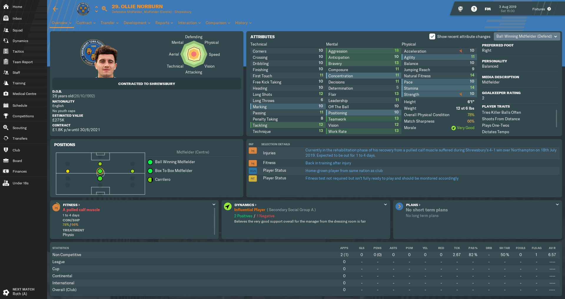 Media reports linking Ryan Haynes with a summer move to Rotherham turned out to be hokum, so he’s staying put for a second season. Haynes doesn’t quite have as much technical ability as Galloway, though he’s less inclined to dive into tackles than his left-back rival. He’s also shown himself to be surprisingly proficient at free-kicks for someone who only scores an 8 on that attribute.