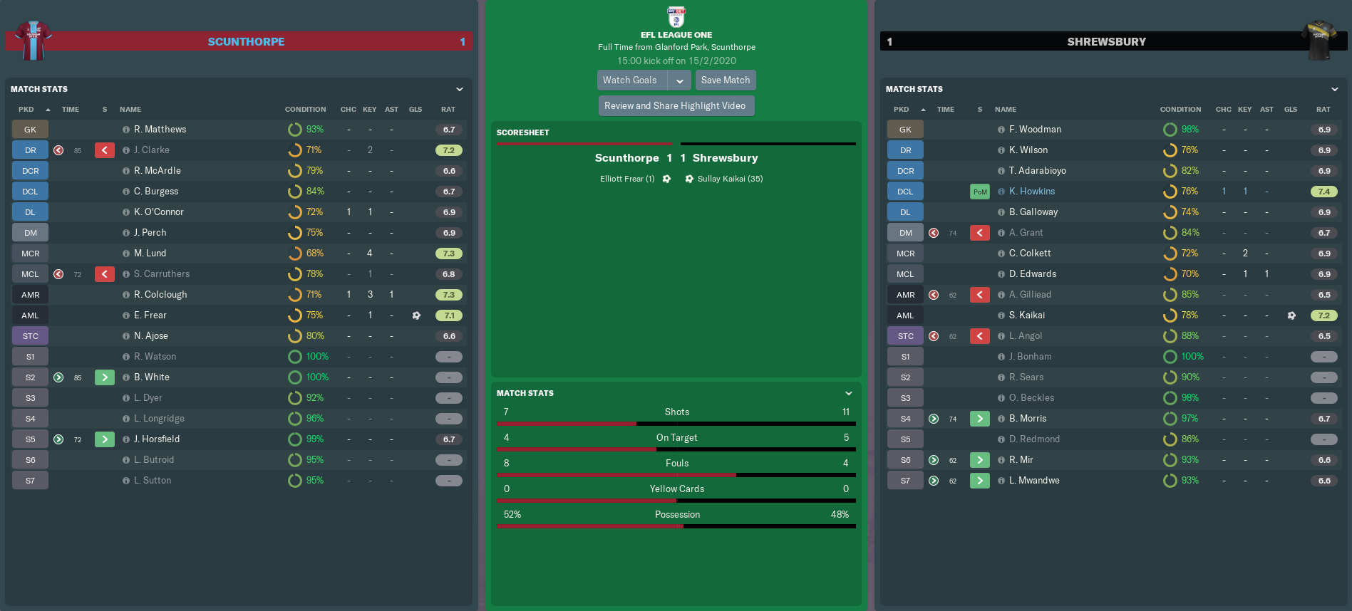 This match saw 4th-placed Shrewsbury travel to 5th-placed Scunthorpe, who would have overtaken us had they won. Thanks to some needless generosity from our right-back Wilson, the Iron were on course to do just that after the opening minute.