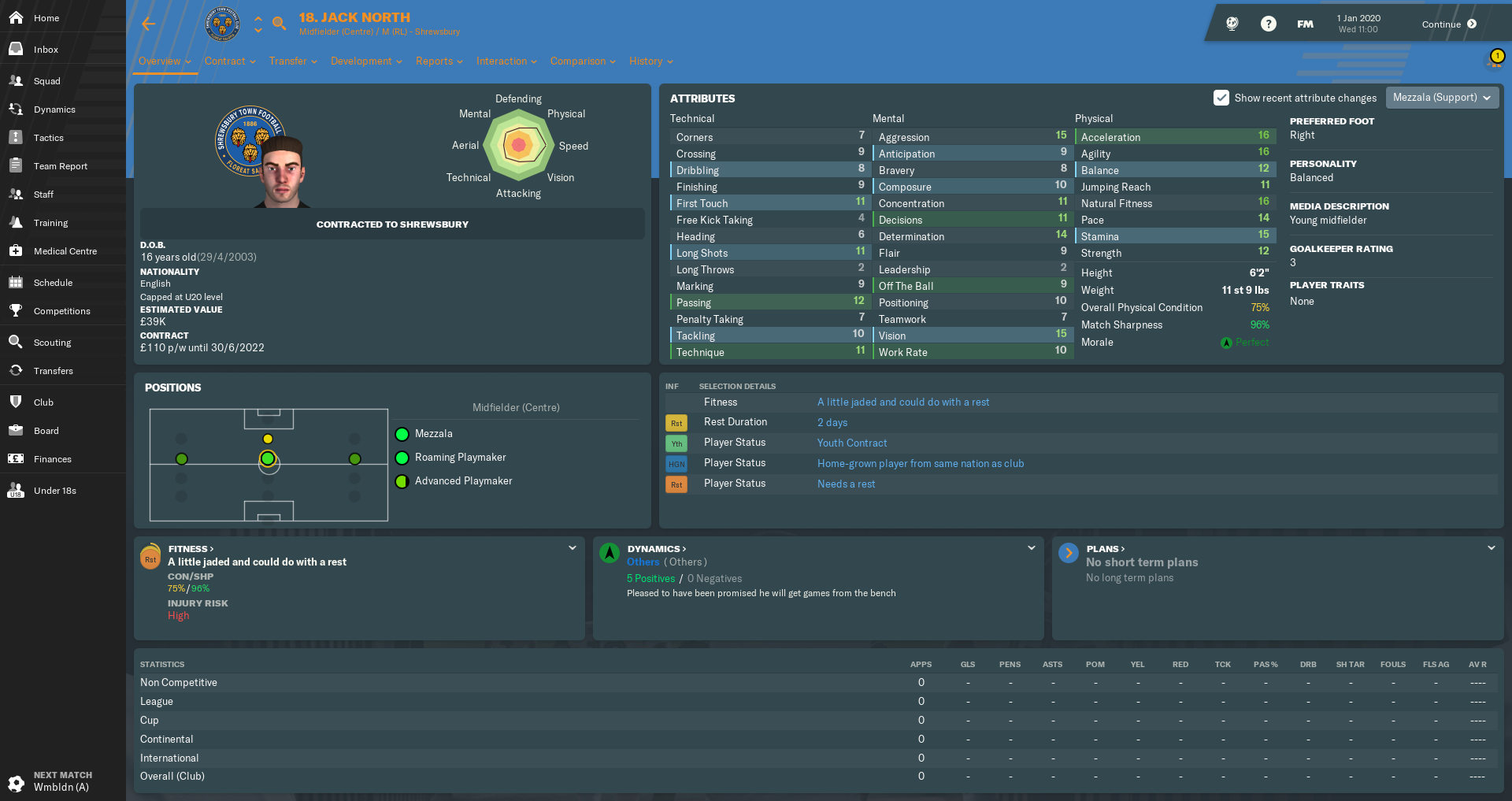 However, Jack had not signed a pre-contract agreement to turn professional with Aldershot. That meant he could be poached by another club, provided that they stumped up £55,000 in compensation plus add-ons. I made my move before anyone else, luring him to Shrewsbury by promising him regular first-team action (from the bench initially), and a £1,000-per-week contract when he turned 17.