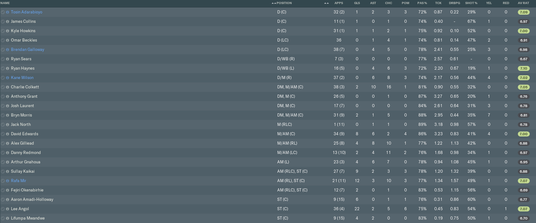 Although eight Shrews players got average ratings of 7.00 or above, there were no real standout performers. Centre-half Tosin Adarabioyo was perhaps the most consistent of our regular starters, often keeping us solid at the back. Adarabioyo ranked 13th overall in League One on average ratings, with Mir and Angol just sneaking into the top 10.