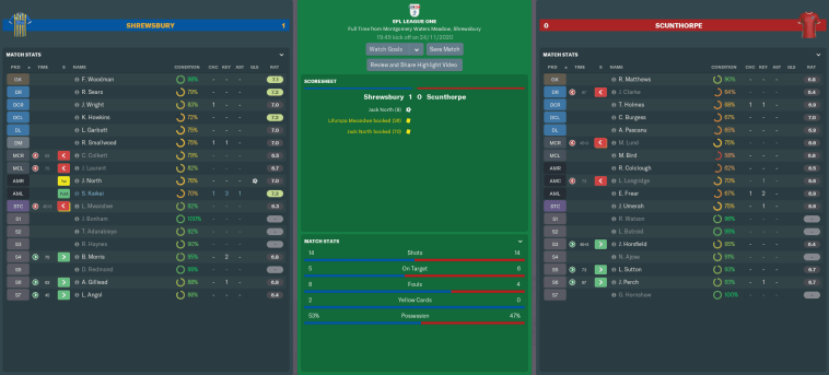 Scunthorpe captain Matty Lund had pulled his groin in an early challenge from Mwandwe, prompting new Iron boss Chris Powell to substitute him at half-time. The visitors struggled without their playmaker, though striker Josh Umerah did put our defence under a bit of pressure. Four of Umerah’s shots were saved by Freddie Woodman, who ensured that Garbutt marked his Shrews debut with a clean sheet.