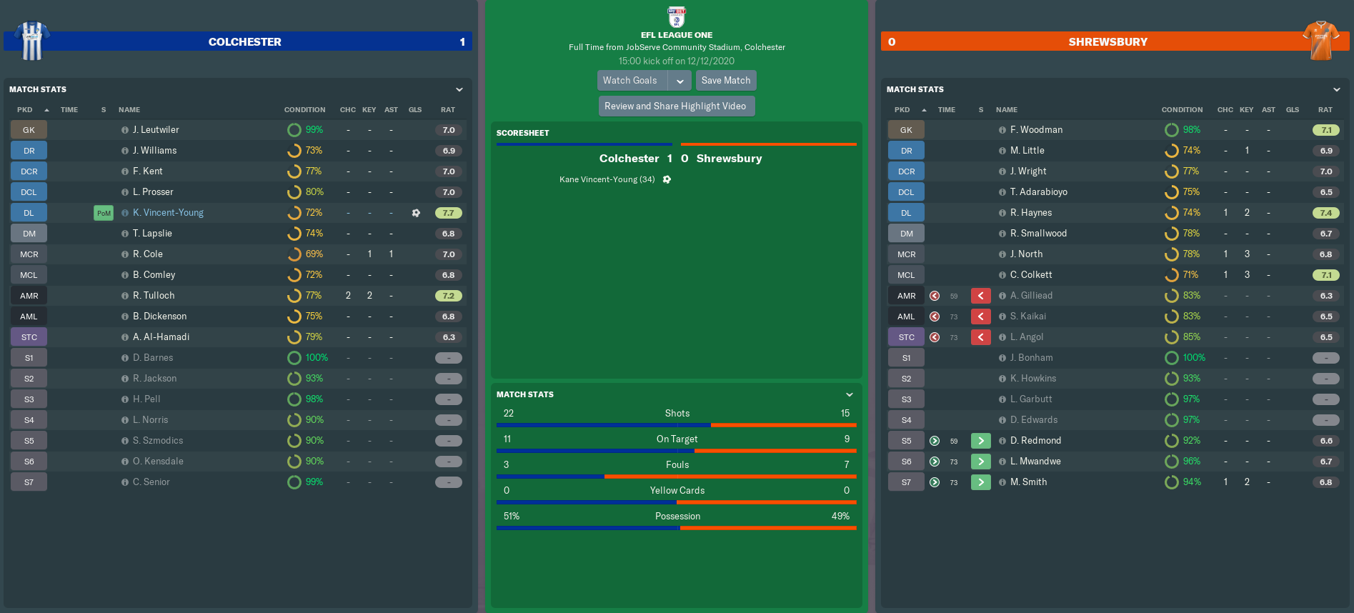 COLCHESTER UNITED vs SHREWSBURY TOWN (League One, Match 23)