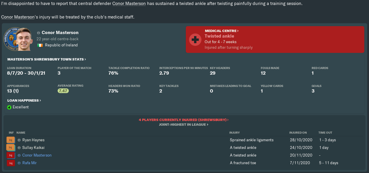 Ouch. Conor Masterson had the highest average rating amongst our senior players so far this season, so to lose the on-loan centre-back for at least a month was quite the blow.