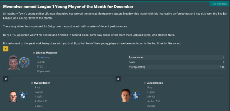 We claimed another victory over Bury’s babes a few days later, when Mwandwe beat two of their top prospects to the League One Young Player of the Month award. His hat-trick at Peterborough was no doubt the key factor behind that success.