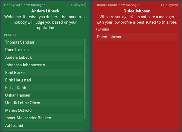 I later signed a couple of very different midfielders. Mads Pedersen is a hard-working Danish defensive midfielder who played in the Eliteserien for Sandefjord as recently as 2015. By contrast, Lars Følstad is a flamboyant advanced playmaker who’s honed his craft in the lower leagues.
