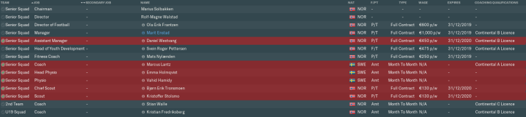 It was up to me to beef up my backroom staff. Ola Erik and I put in some job adverts, and within a few weeks, we’d signed up six new staff members, who are highlighted above in red.