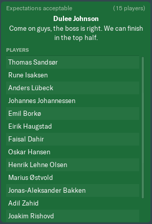 Johnson’s profile says that he is outspoken, volatile and confrontational [that probably explains why he’s had more clubs than Tiger Woods]. I suspect I’m not the first manager he’s tried to rile up, but I put on a smile as I told the team of my ambitions. My goal for this first season was to stay clear of immediate relegation back to the 3. divisjon and finish in the top half, and then build from there.