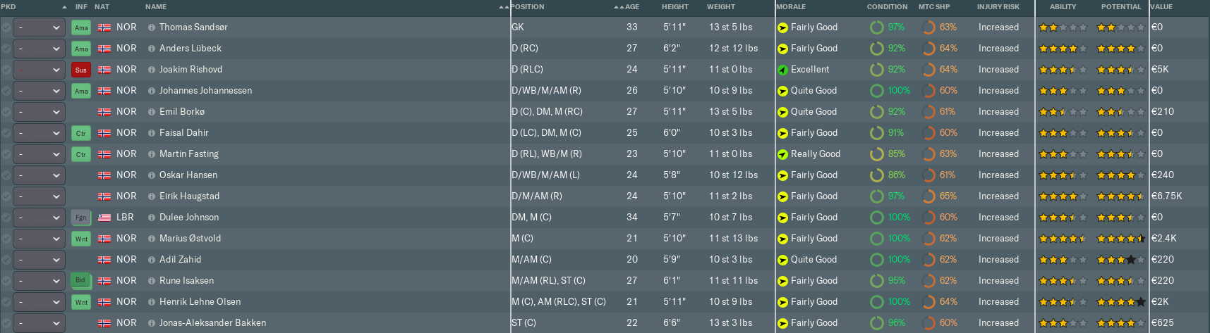 Last, but not least, we paid actual money for a quality striker on deadline day. Martin Trøen was transfer-listed at 1. divisjon side Ullensaker/Kisa, who agreed to part with him for €2,800. Time will tell if this was a panic buy or a smart move, but with his acceleration and his lethal finishing ability, I reckon Trøen will be worth the outlay.