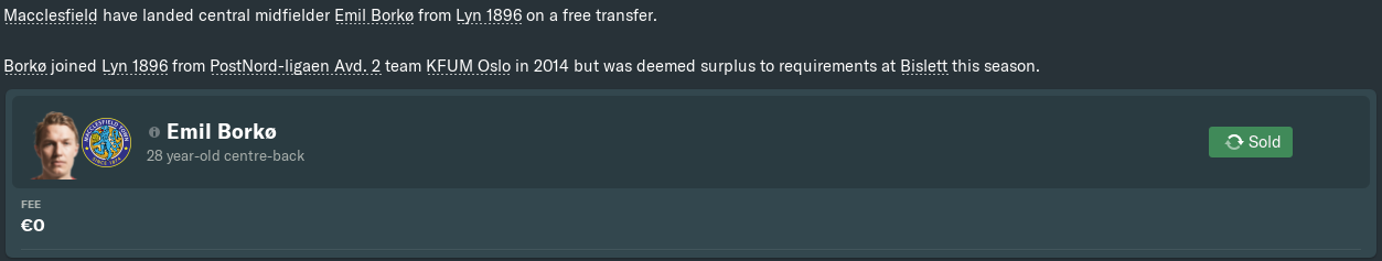 Defensive midfielder Emil Borkø was surplus to requirements, so I decided to let him leave on a free transfer to free up some of his wages. He signed for English League Two side Macclesfield, who now have SIX Norwegians in their squad. [A Norwegian influx in England? What year is this, 1996?]