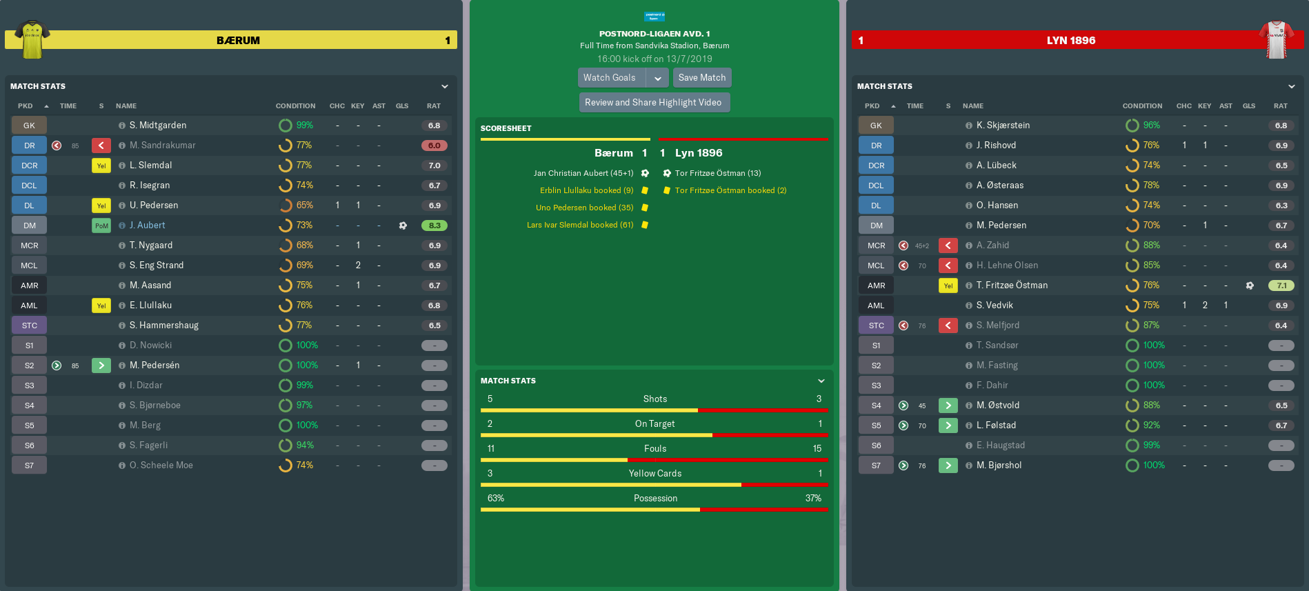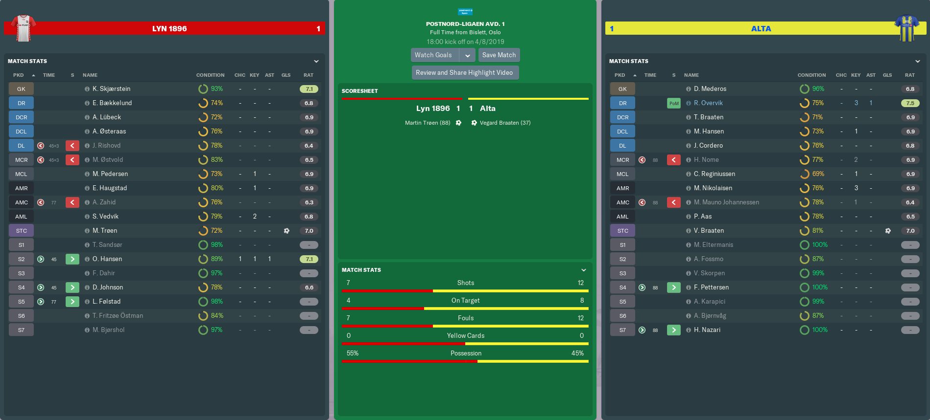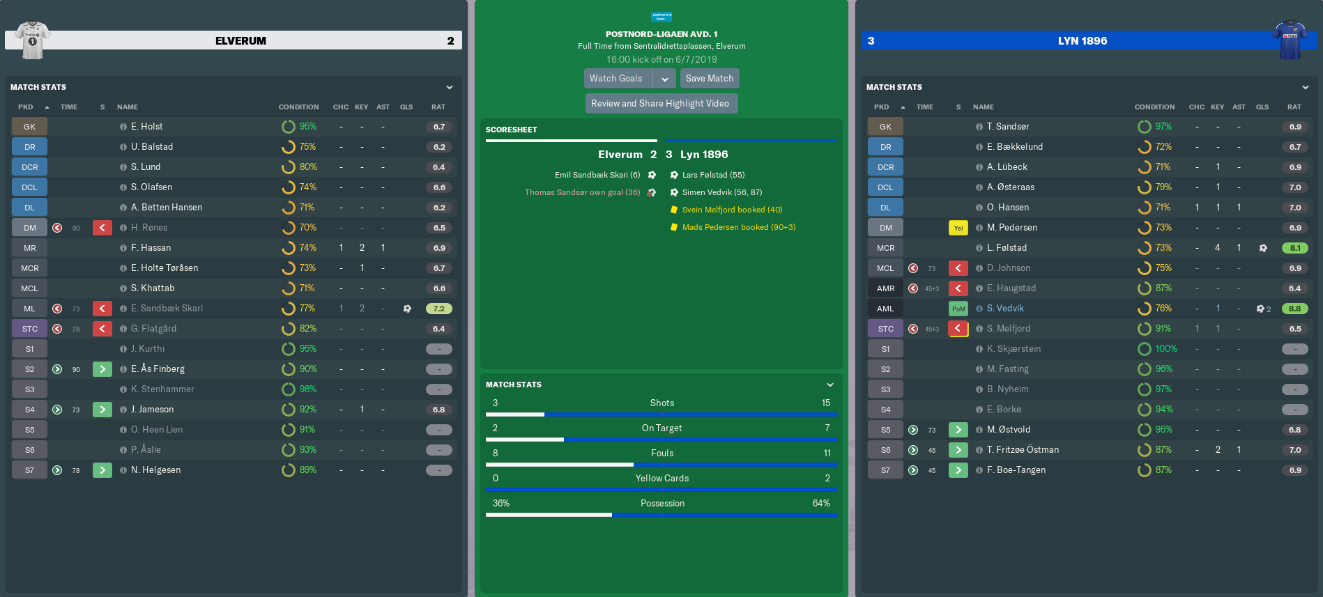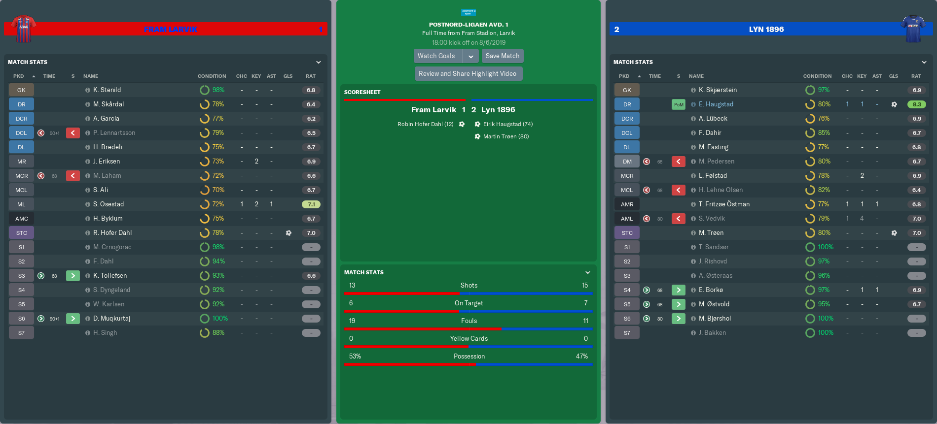 To be fair to Skjærstein, he later made some strong saves to keep Raufoss’ lead down to 1-0. Lübeck also performed admirably with some vital interceptions, but the rest of the team let me down badly. This was not the performance of promotion contenders.