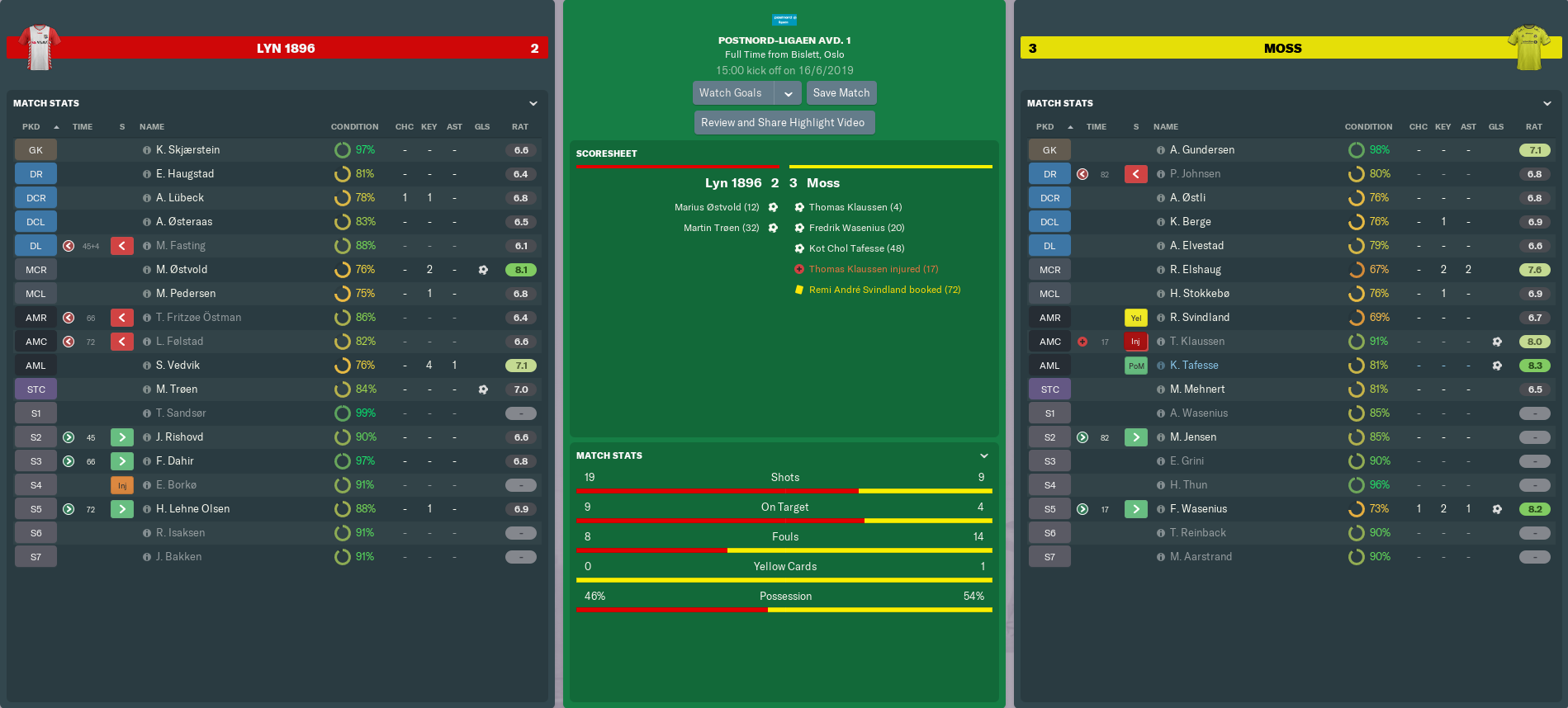 Our first equaliser came in the 12th minute, when Østvold dribbled into the box and slipped in a tidy finish. Further encouragement came when Moss lost Klaussen to a groin injury in the 17th minute, but his replacement Fredrik Wasenius put the visitors back ahead just three minutes later. His goal came about after a sloppy throw from Fasting, who performed so pitifully that I subbed him at half-time.
