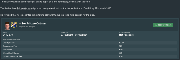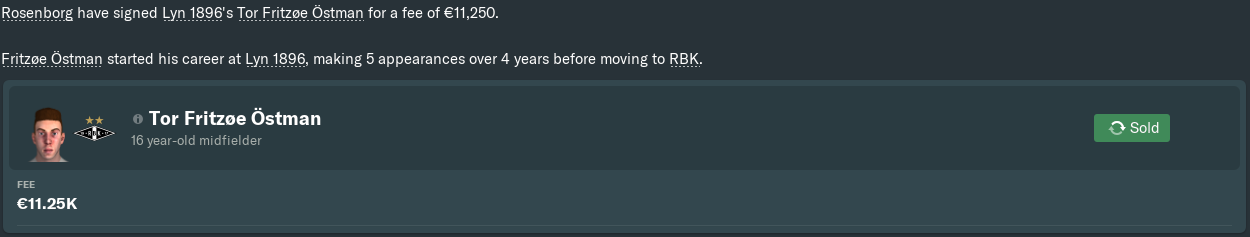 [Groan] So THIS happened. Five Eliteserien clubs came in for Fritzøe Östman on transfer deadline day, all offering €11,250 – and no sell-on clauses. Our chairman Marius Solbakken went over my head and accepted all of them without even bothering to negotiate!