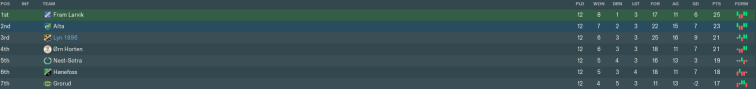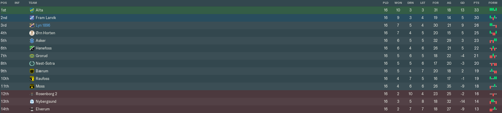 That result took us into the top three, just ahead of Ørn Horten on goal difference. Fram Larvik and Alta remained four and two points ahead respectively, as they had done for the past few rounds, but if we could continue our recent good form, we would surely reel them in.