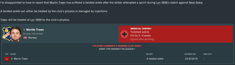 …Trøen twisted his ankle, ruling out of our next three games before the mid-season mini-break. He was now the division’s leading scorer (with nine goals), but somebody would need to fill his big boots for the time being.