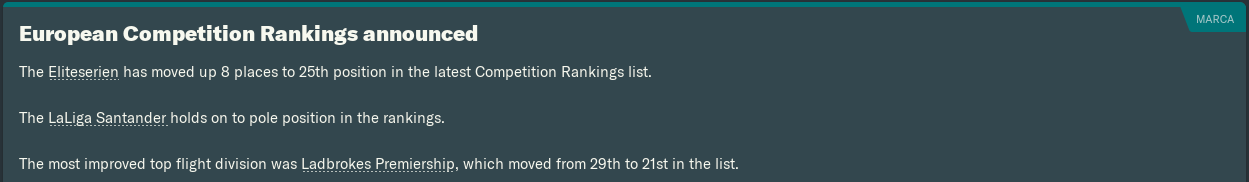Meanwhile, the Eliteserien received a nice reputation boost at the end of the European season. Norway’s UEFA club coefficient has also gone up a fair bit, from 29th to 23rd. [I see Scotland also climbed up the rankings. It helps when Rangers don’t get dumped out of the Europa League by part-timers from Luxembourg, doesn’t it?]