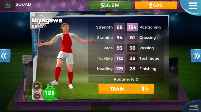 Players develop attributes through training at a largely linear rate until they reach their peak, which is mainly based on their ‘rarity’. The rarer the player, the more scope they’ll have for improvement. There are seven rarity levels, ranging from ‘Common’ (average Janes) to ‘Mythical’ (think Birgit Prinz or Michelle Akers, but even better). You can get a good idea of how close a player is to maximising her potential by swiping on her profile and looking at the ‘Development’ bar.