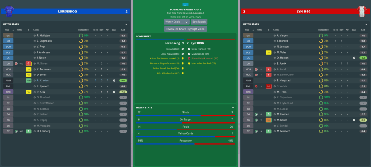 The second half proved to be a battle, and it was Lørenskog who pulled themselves in front midway through. Alba and Krawiec swapped roles for their second goal, with the Dominican striker allowing the on-loan Sandefjord winger to dribble through our defence before beating Vangen from long range. [Yeah… now I’m starting to suspect something might be up with FM19’s match engine.]