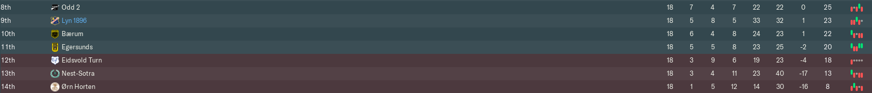 Egersund’s victory took them out of the relegation zone, ahead of Eidsvold Turn by just one goal. As far as we were concerned, the gap between us and 12th was down from a comfortable eight points to a more worrying five.