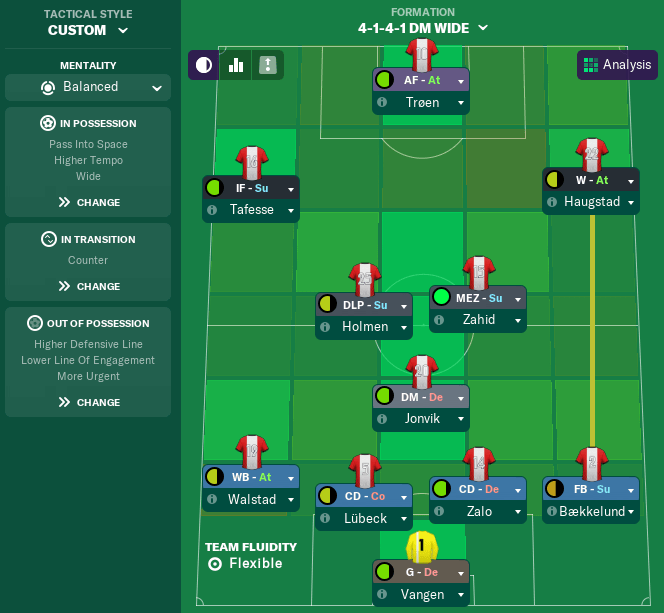 I will again be using my main two tactical systems this season, with a few more tweaks. I will mainly use this 4-2-3-1 at the Bislett, where we’ll hope to rule the midfield on a narrower pitch than we’ve previously used for home games.