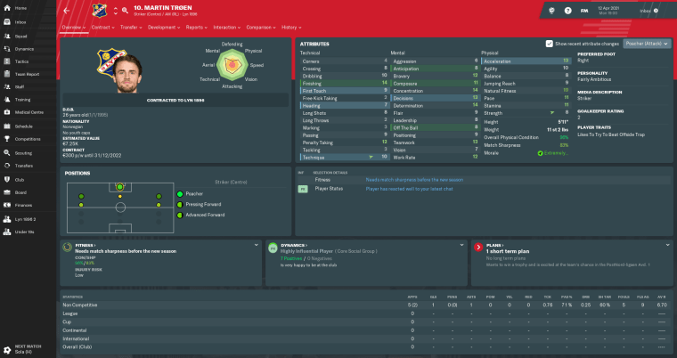 And then we come to my final signing of the winter. Lehne Olsen’s exit left us needing a new midfield playmaker, and that was where Gaute Høberg Vetti came into the picture. Gaute made 13 assists for Elverum as they won their 3. divisjon group last season and were promoted back to the 2. divisjon. I was so impressed by his creativity and intelligence that I signed him for €1,500, which could be a bargain.