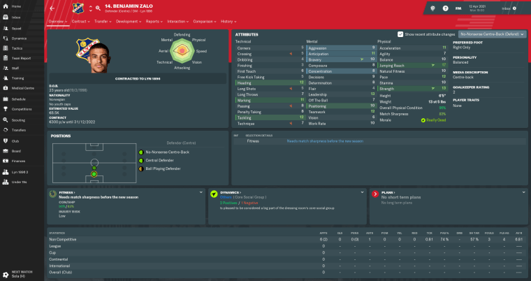At left-back, Walstad looks a good option for a team at this level. He’s got excellent tackling ability and is a reasonable crosser of the ball. [Just ignore that 1 Determination for a moment, please.] Nikolas will provide serious competition for our cool-headed vice-captain Joakim Rishovd and our very consistent free-kick virtuoso [and friend of the blog] Oskar Hansen.