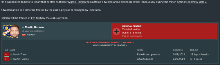 Things then went quiet until roughly a fortnight later, when both our Martins got injured in the same reserve match. Trøen pulled his knee ligaments and would miss our next two matches. More alarming was that Holmen twisted his ankle, ruling the experienced box-to-box midfielder out until at least September.