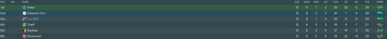 With the two frontrunners having drawn their matches, we were now only three points off leaders Asker, and one behind Eidsvold Turn. If we bettered Eidsvold’s result in the next round of fixtures, we would climb into the play-off spot at their expence – and possibly even into the automatic promotion place.