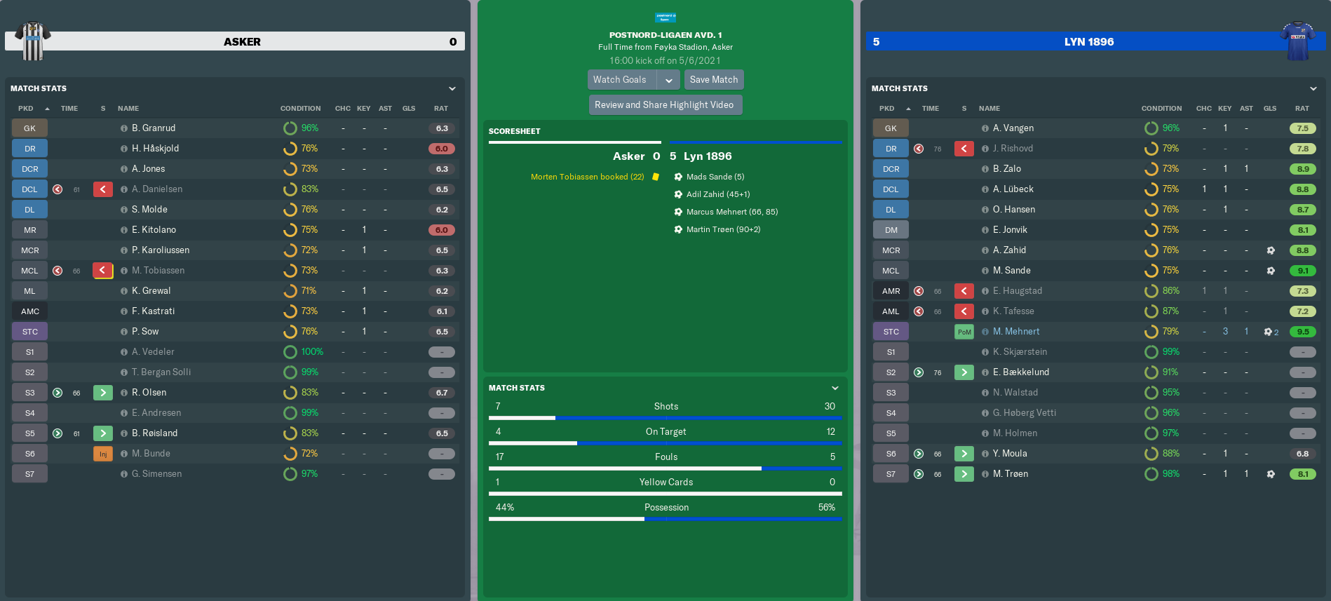 A week after scraping past Eidsvold, we recorded a SIXTH straight home win by destroying Fram Larvik. We were dominant from the ninth minute, when Sande’s long ball sent Mehnert bursting through on goal. A powerful finish earned Marcus his seventh goal this season, and he wouldn’t stop there.