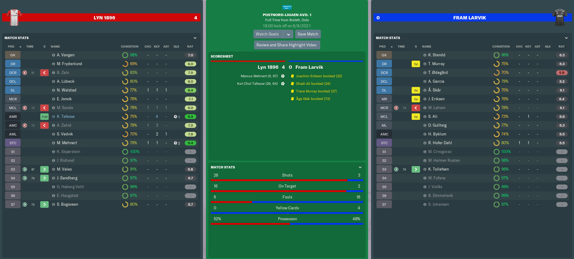Careless tackling from Fram earned them three quickfire yellow cards in the middle of the first half. Their plight got even worse in the 29th minute, when Tafesse drove in another long-range stunner – this time from a central position 25 yards out, and with his ‘weaker’ left foot!