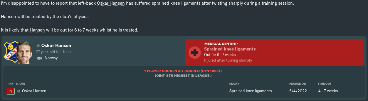 More disappointment came a few days later. Having already seen Olsen Solberg overtake him in the left-back pecking order, Oskar Hansen‘s rough start to the year continued when he sprained his knee ligaments. Oskar was ruled out for the better part of two months, and I now had to rotate my full-backs more carefully.