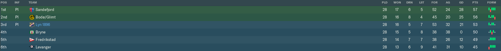 Here’s how the play-offs work. You’ve got two single-leg Semi Finals between Lyn (3rd) and Tromsø (6th), and between Bryne (4th) and Fredrikstad (5th). The winners meet in a single-leg Final, again hosted by the higher-ranked team. Finally, whoever wins that will face the Eliteserien’s 14th-placed team over TWO legs for a place in next year’s top flight.