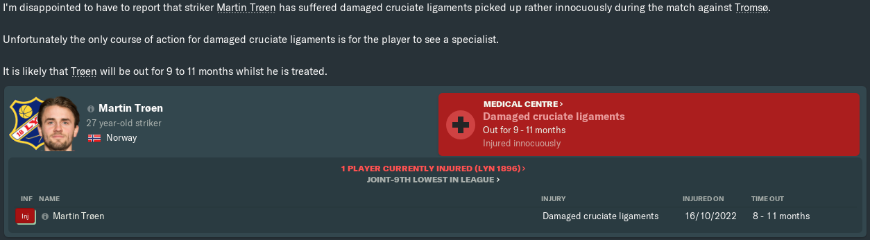Unsurprisingly, Lyn players made up most of the 1. divisjon’s Team of the Week. Our entire back four was joined by Høberg Vetti in midfield and Helgesen up front… but I was now more concerned about another striker.
