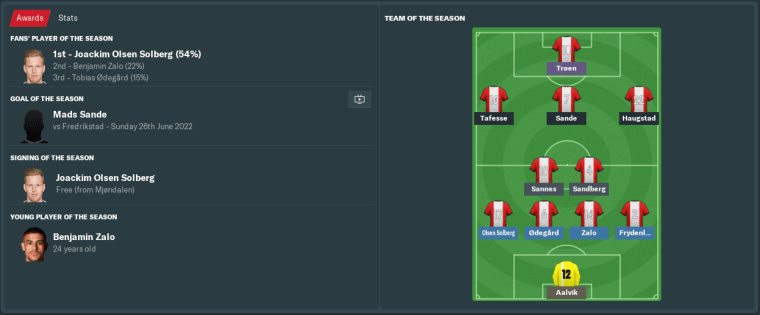 Olsen Solberg averaged 7.49 to earn himself the 1. divisjon Player of the Year award. Zalo’s 7.39 average placed him 2nd in the division, with Jesper Sandberg (7.27) and Ødegård (7.20) also in the top 10. Right-back Markus Frydenlund was also right up there until some mediocre late-season displays saw his rating drop to ‘only’ 7.13.