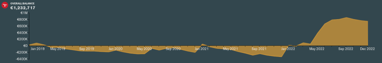 Wow. Our financial situation is very different to 12 months ago, for sure! We were barely in the black at the end of 2021, but a year in the 1. divisjon has seen us make a profit of over €1.2million!