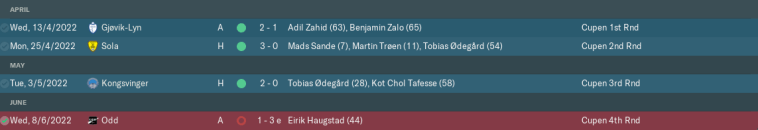 Our Cupen run almost ended at Round 1, as lower-league Gjøvik-Lyn took the lead before we battled to victory. Sola were rather easier opponents in the next round, and we serenely progressed to a Round 3 meeting with top-flight Kongsvinger. Goals from Tobias Ødegård and Kot Chol Tafesse delivered not just one upset, but also the chance to cause a second.