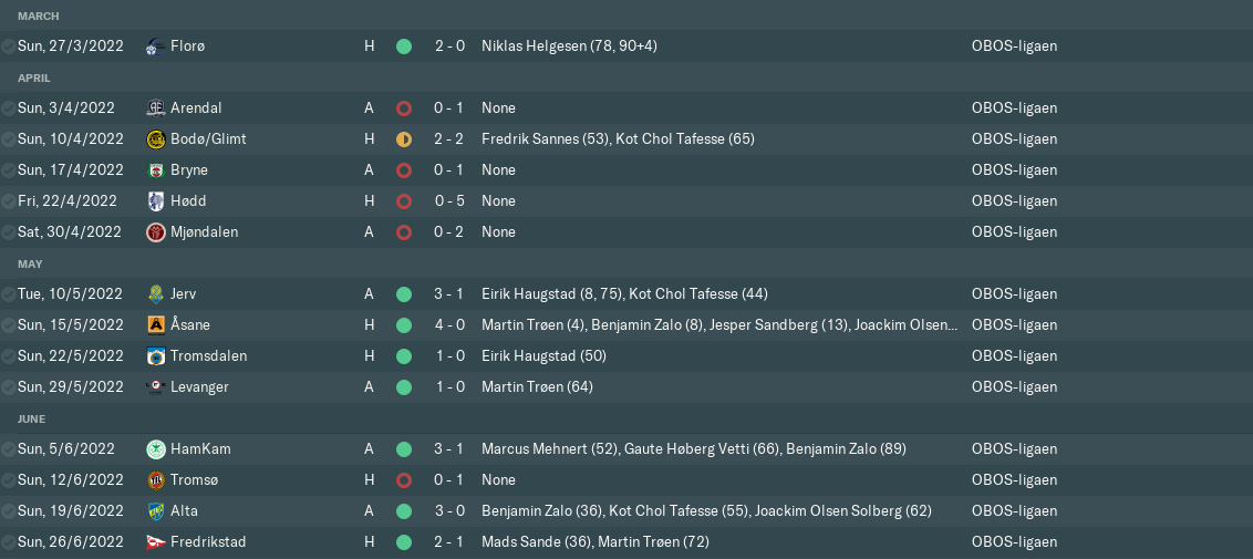 We looked more solid in the play-off spots after seeing off Levanger in a match that saw Martin Trøen return to form. The frontman scored four goals in as many matches before cruelly tearing his cruciate ligaments at Tromsø, cutting his season short. Despite that, we were now guaranteed a top-six finish at worst and could now set our sights higher.