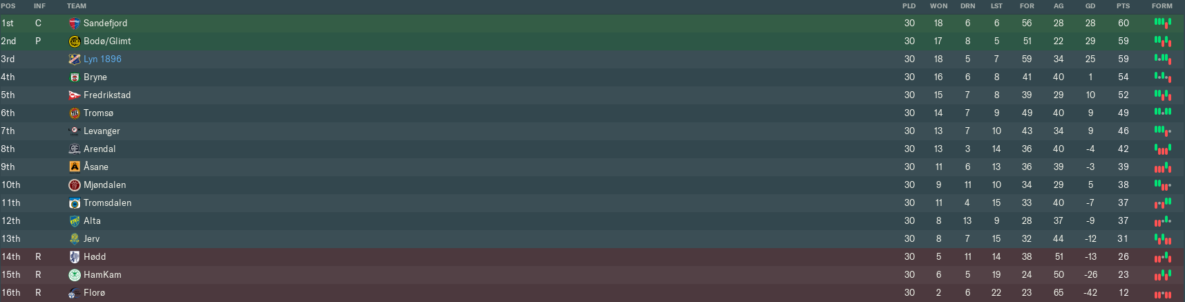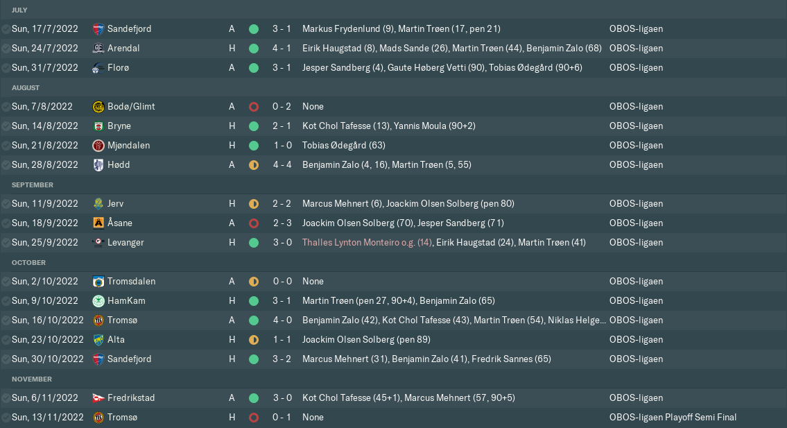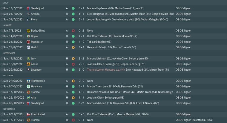A late Olsen Solberg put us 1-0 up at home to Alta, but the visitors stole an even later equaliser, which would prove very costly. We then beat eventual champions Sandefjord – after surviving a barrage with only 10 men for the entire second half – and Fredrikstad to finish the regular season on a high. Unfortunately, we missed out on promotion to Bodø/Glimt on goal difference, and just two more points would’ve claimed us the title.