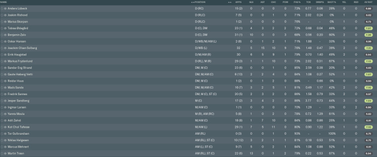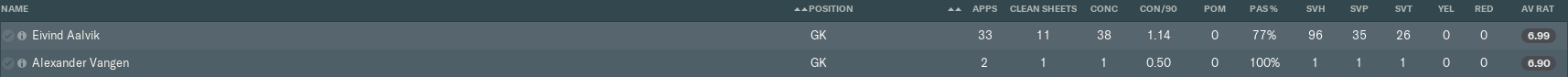 It wasn’t quite a delightful dozen this time, but it was still good to see eight players earn match rating averages above 7.00. Even our new shotstopper Eivind Aalvik came very close to joining that ‘club’ [which is not bad going, seeing as goalkeeper match ratings are notoriously low on FM].