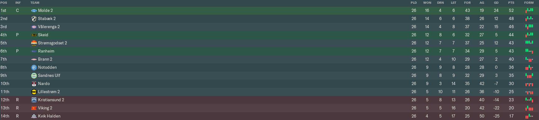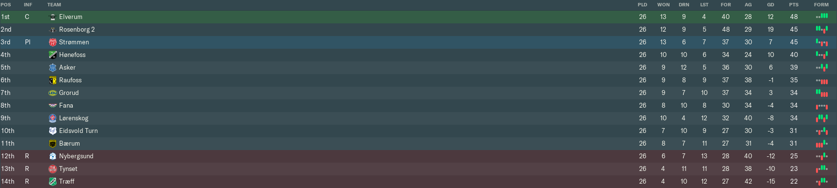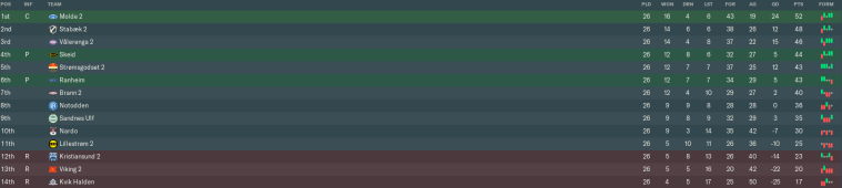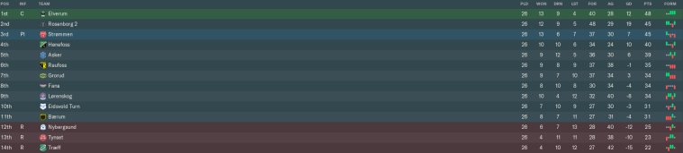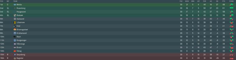 The rest of April was awful, as we lost three matches in a row without scoring. The nadir came at home to Hødd, whose direct counter-attacking game ripped us to pieces. We lost that match 5-0 on our way to ending the month in 14th place out of 16.