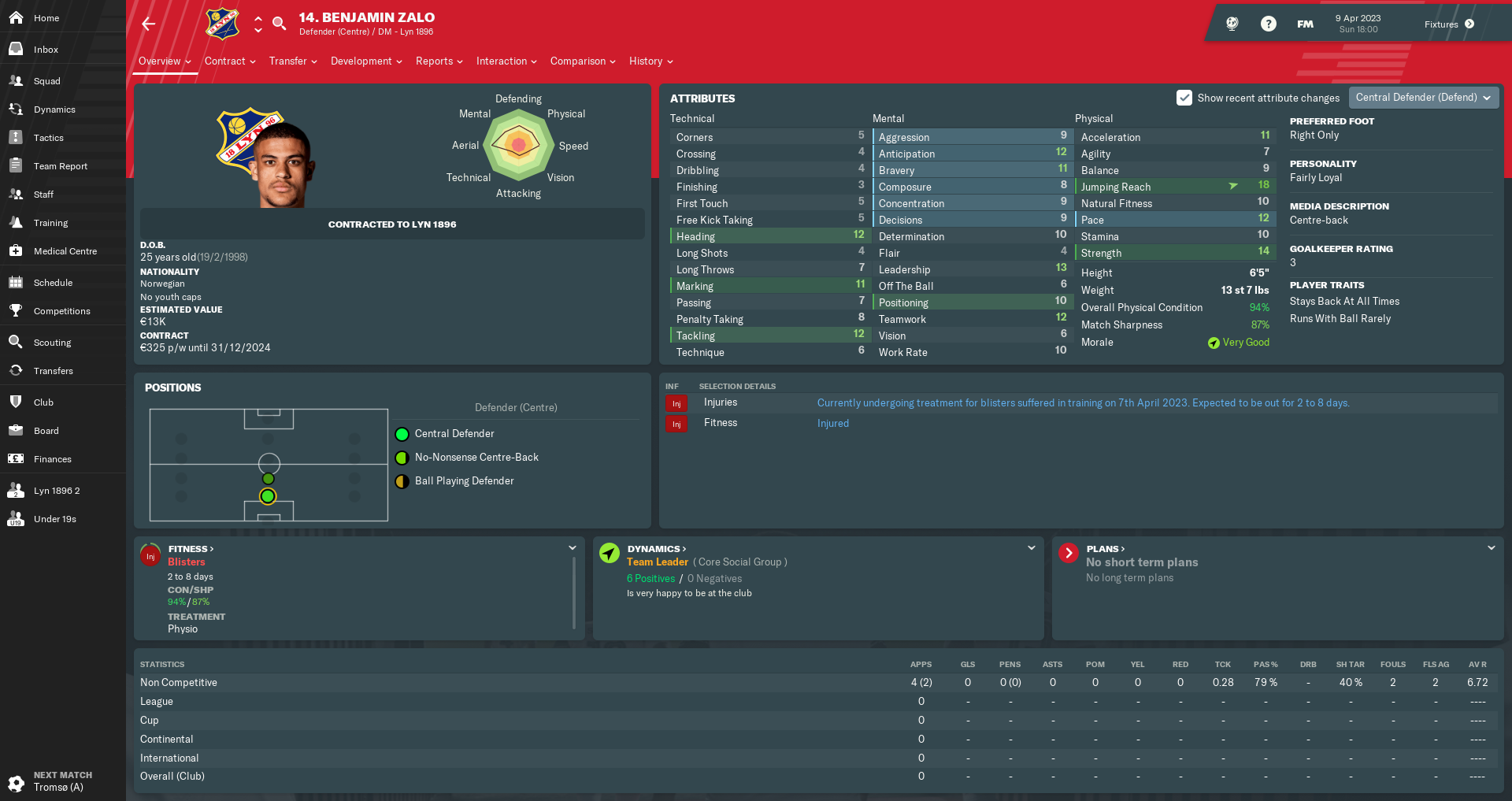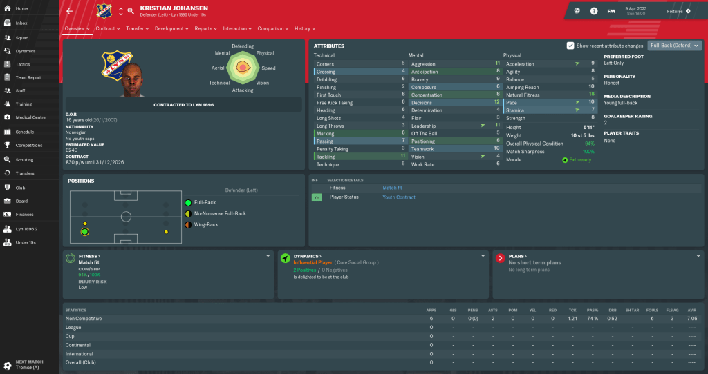 We’ve also got a reasonably promising left-back in the wings (yes, another one). Kristian Johansen is a fairly aggressive player who could develop into a useful asset over the coming years. Kristian has a honest personality, which implies that he shows great sportsmanship but not much determination.