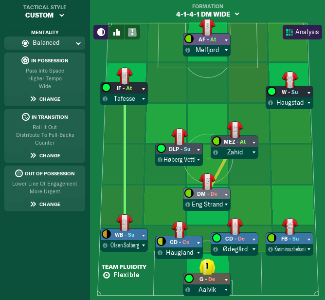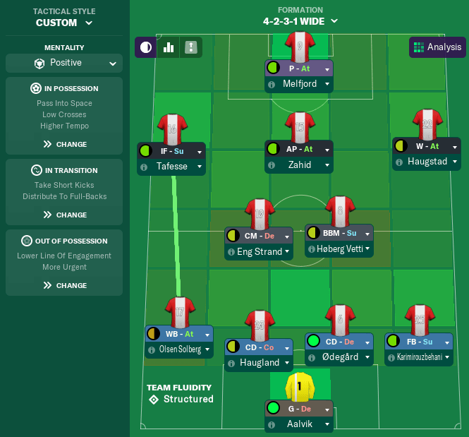 The addition of Karterud means that I can also change the 4-3-3 to accomodate him. Whenever we have Brage on the left wing, I might use Helgesen as an inside-forward, though Tafesse has been effective there in the past despite being far from natural.