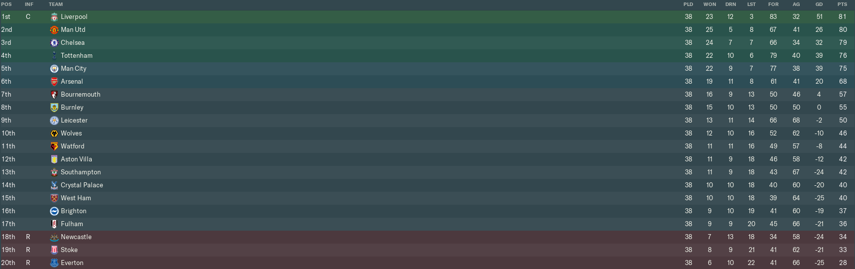 | 2018/2019 | 1. Liverpool 2. Man City 3. Man Utd |