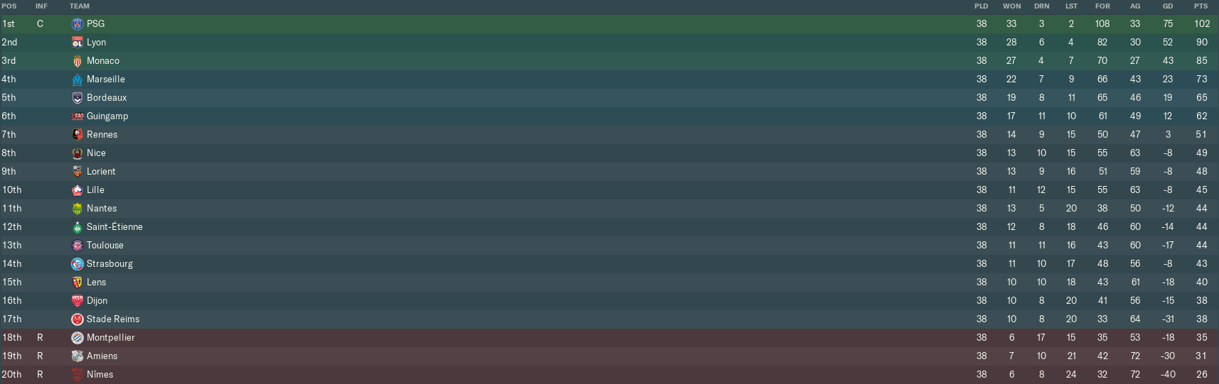 | 2018/2019 | 1. PSG 2. Monaco 3. Lyon |