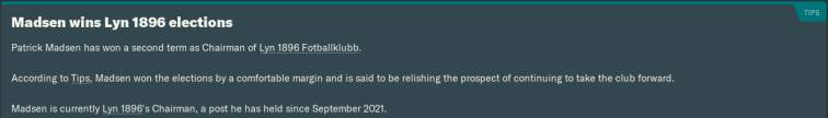It was election time once again at Lyn, and Patrick Madsen easily won a second term as chairman. I was quite pleased with that, as I get on incredibly well with Patrick. For one thing, he doesn’t sell our best young prospects for ører without trying to negotiate a sell-on clause first!