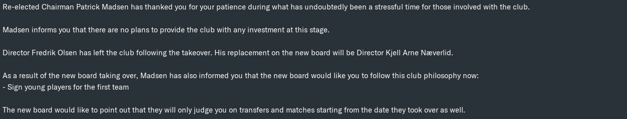 After his re-election, Patrick told me that he wouldn’t inject any more funds into the club just yet (not that we needed any). Interestingly, though, he said that the board would now like me to start signing young players for the first-team as part of a new club philosophy. You all know that I tend to do that anyway, so that shouldn’t affect my job security too much.